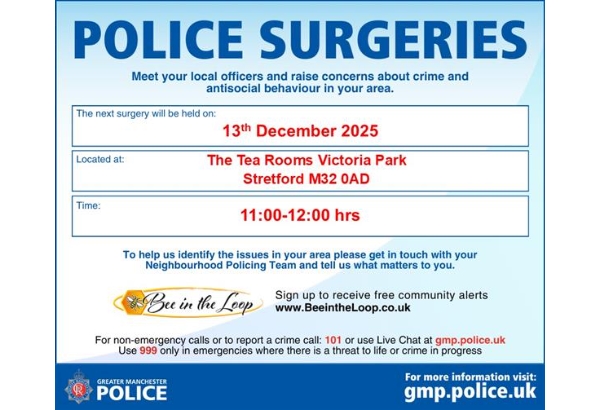 PCSO's Julie and Danny will be at Victoria Park 13th December 11am feel free to come and say hello, share your concerns or feedback so we can respond to what matters to in your community.